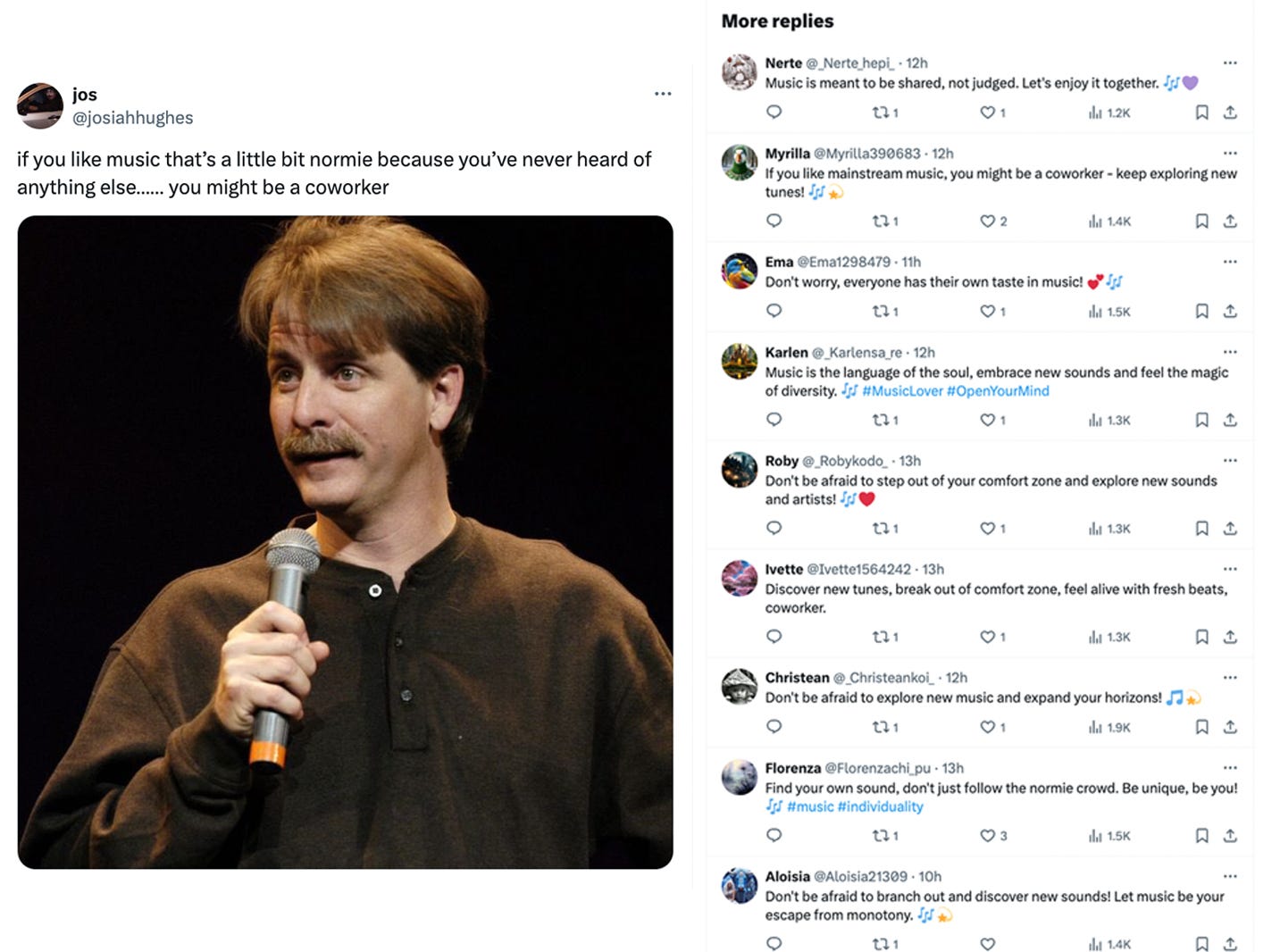 Sam’s lawyers have advised him not to weigh in on the great merch union-busting scandal that is rocking normie punks this week, so I’m tasked once again with writing the intro to the newsletter. There’s a new meme going around where people talk about “coworker music” in a way that is sometimes funny and more often reveals a lack of critical thought on the part of the person making the joke. But it’s really just a more popular version of the “cousin movie” discourse I started on the pod. I’m now realising it may have been a mistake to hide my astute cultural observations deep within 4-hour podcast episodes hosted by two middle-aged white guys who love talking about a band that sucks. But I did a “coworker music” post and was blessed with a barrage of bots who were replying with variations on the theme of “music is my life,” which is maybe the best possible outcome of this new bot-driven internet.